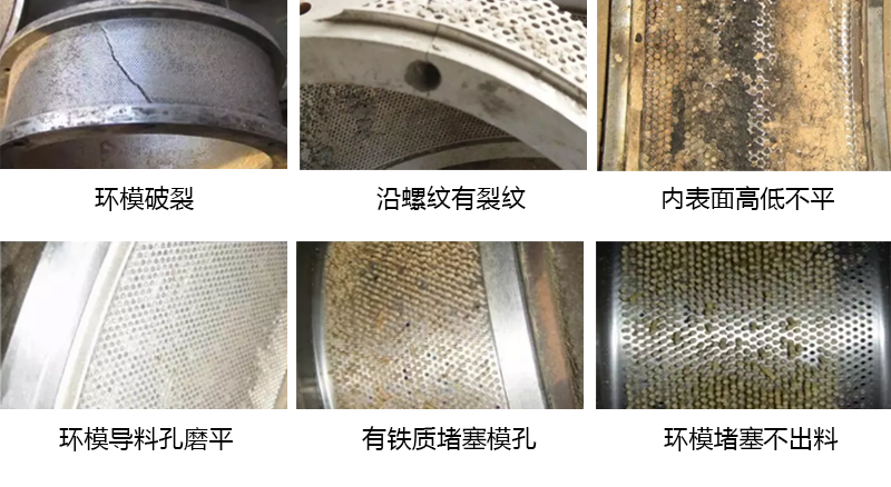 2、環(huán)模在運(yùn)行過(guò)程中被落在制粒室內(nèi)的軸承滾珠等金屬硬物強(qiáng)行擠入。